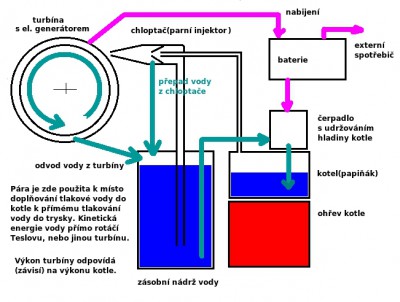 Zde je přímý výstup z injektoru na turbínu. Pára přes trysku nasává vodu a kondenzuje v ní. Pará proudí velkou rychlostí a kinetickou energii předává vodě. Voda proudí velkou rychlostí k turbíně a roztáčí ji. S turbínou je spojen el. generátor. Generátor nabijí baterii, nebo přes regulaci napájí externí spotřebič. Na baterii je připojeno čerpadlo doplňování vody do kotle. Šlo by použít i druhý injektor. Odpadní voda z turbíny a injektoru se vrací mírně ohřátá do zásobní nádrže. Výkon je závislý na tlaku a teplotě páry. Tedy na výkonu kotle. Regulace na výstupu páry redukčním ventilem. Také by tak mohla fungovat parní stříkačka. Jaký to má zádrhel, že to takhle nikdo nepoužívá?