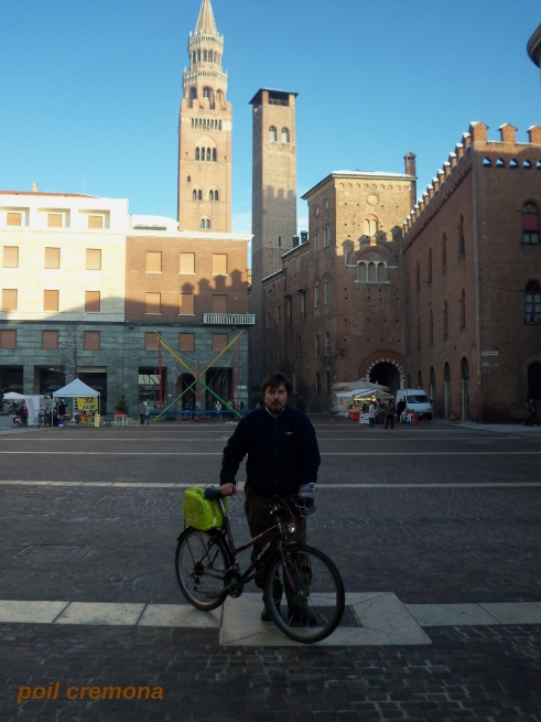 Cremona a Stradivari. Pozdní listopad s teplotou okolo nuly. V jednom stánku v pozadí propagovalo cykloturistiku místní cyklistické združení. Turista z Čech na kole byl pro ně překvapením. Potkal jsem tam dechovou kapelu z Bolzana, co hrála "Škoda lásky" a jiné podobné skladby z Čech. A nehráli vůbec špatně. Najel jsel ten den ale jen 40km dohromady.