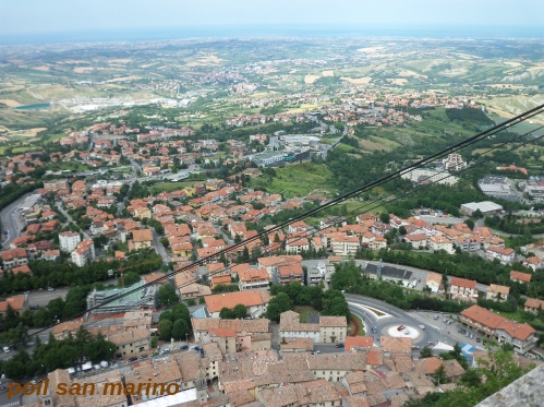 Tohle jsem zdolal pěšky od moře a zpět za den. Moře je to tmavší modré na obzoru. Pohled z terasy od lanovky východně k Rimini. Lanovkou jsem nejel. Zdála se mi drahá. A kdeže jsem? San Marino. Neskutečné horko během dne! Trochu rozdíl s výletem na Monte Cavallo.
