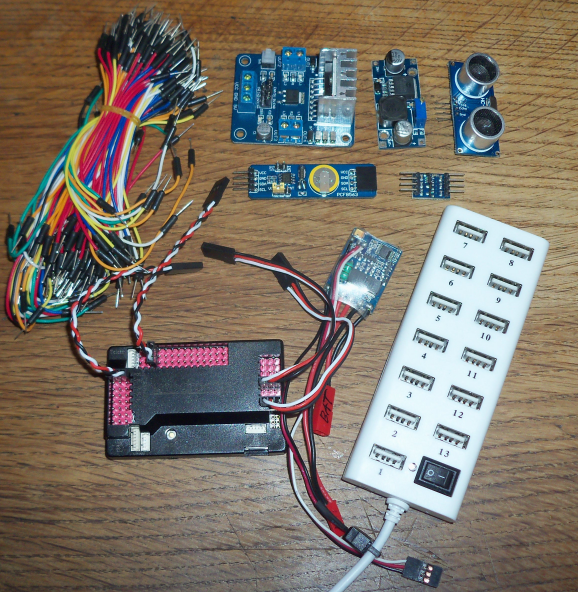 Obrázek obsahuje napájený hub s 13 usb konektory, regulaci stejnosměrného motorku, Ardupilot mega 2.6, propojovací kabely k bastl deskám, I2C hodiny reálného času, I2C převodník 5V-3V3, regulátor dvou stejnosměrných motůrků (či jednoho krokového), modul nastavitelného pulzního zdoje napětí 3A a modul ultrazvukového sonaru.