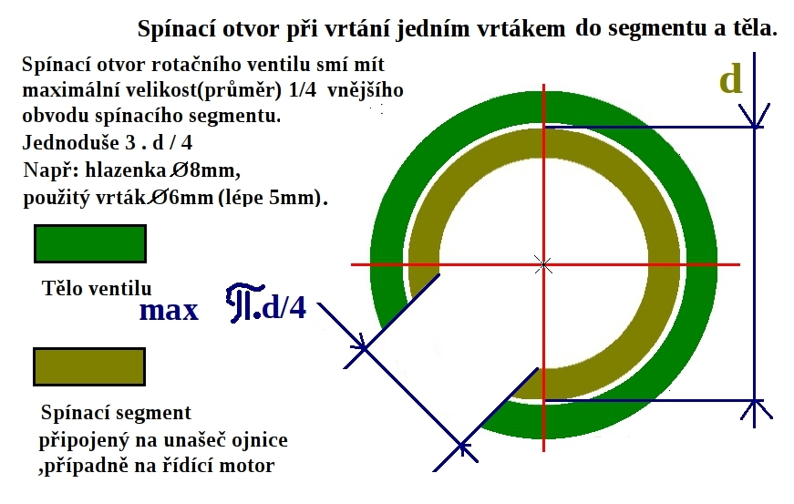 Teorie pro vrtání odpovídajícího spínacího otvoru. Na hranách segmentu(osy) nezabrušovat hrany. Tohle ale neplatí, pokud chceme jiný poměr časování a otvor musí být o trochu menší, než 1/4 ¶d. Světlost lhe dohnat způsobem uvedeným na dalším obrázku.