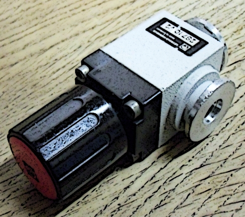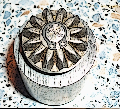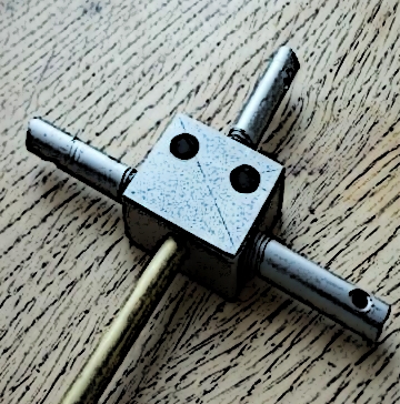 Jeden z pokusů o ventil. Spínací osa poháněna přes šikmá ozubená kola. Osa železná hlazenka 8mm. Spínací otvor osy 4mm. Malý vložený obrázek vlevo nahoře je detail svrtání přes trubičky(mírná nesouosost). Připojovací trubičky na závit 6mm. Vstup/výstup válce v ose ventilu.