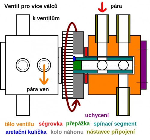 Rotační osa ventilu p. Murína. Je to expanzní verze s odděleným vstupem a výfukem páry p. Šedého