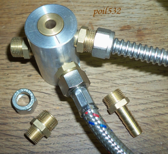 Opět vlastní výroba. Tentokrát z menší mosazné kulatiny. Otvory v přívodech slouží k uchycení při výrobě a k montáži. Také to omezuje sklouznutí hadice při připevnění sponou. Ventil je také výrazně zkrácen.