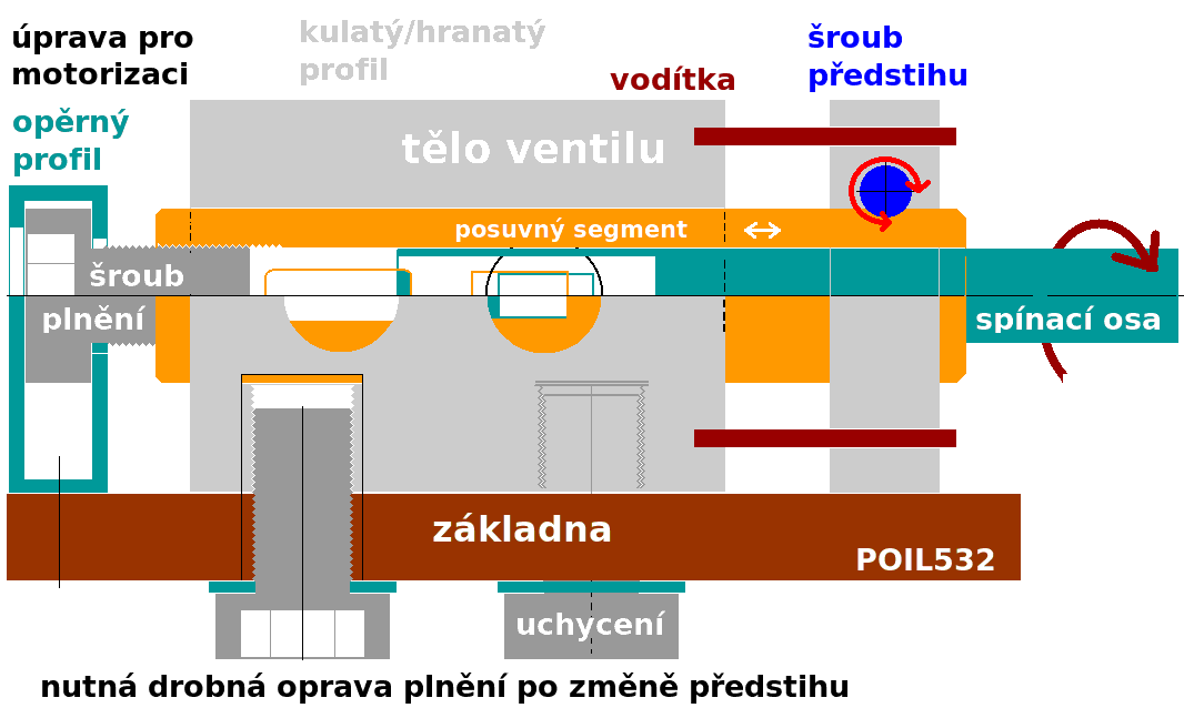Vlastní rotační ventil, ale s "otočenými" materiály. Dva horní otvory složí k uchycení.